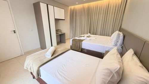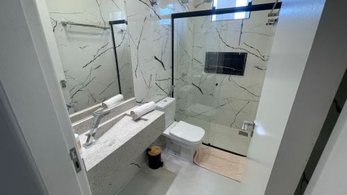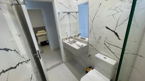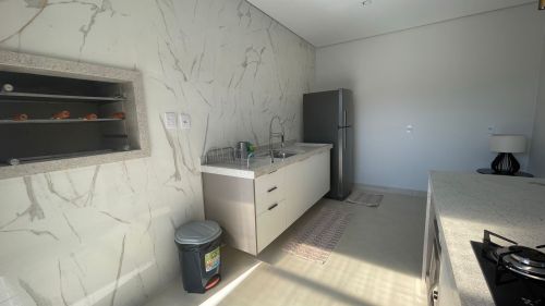 E o melhor: cozinha com churrasqueira pra aquela resenha à noite, um banheiro no piso de baixo e, lá em cima, 2 quartos + mais 1 banheiro, tudo bem organizado. Ah, e o ar-condicionado tá em todos os ambientes (menos nos banheiros), então dá pra dormir no gelo mesmo no calorão.