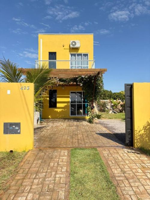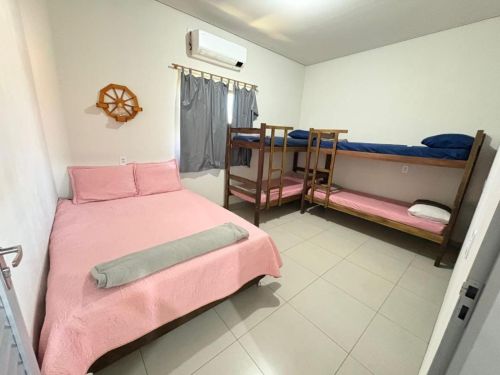 A casa tem ar-condicionado, 3 quartos, sala, cozinha completa e 3 banheiros — ou seja, dá pra ficar bem confortável, principalmente em grupo ou família.