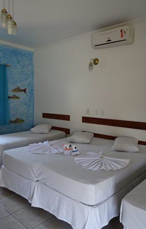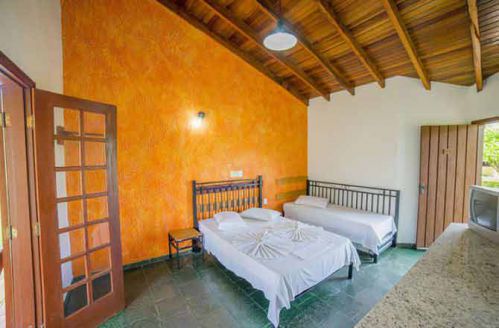 O Quarto Duplo está equipado com cama box de casal e assim como a acomodação anterior ele também conta com ar condicionado split, frigobar com capacidade máxima de 19 L, TV, cofre, secador de cabelo, telefone e varanda equipada com rede voltada para o jardim. Salientamos ainda que esta opção também conta com um guarda-roupas de tamanho ótimo para a organização das roupas, sapatos e acessórios durante a viagem.