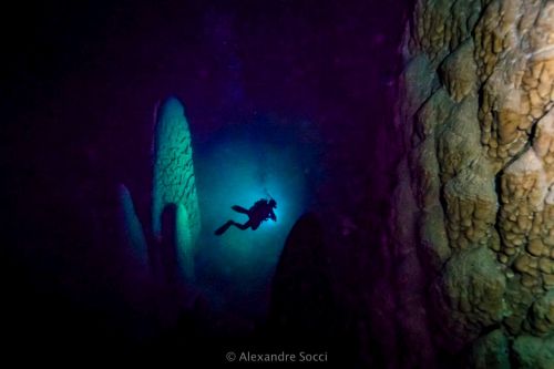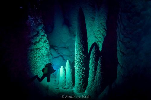 Contando com a boa iluminação do local, aliado com a excelente visibilidade da água, é possível avistar um amplo salão submerso, repleto de estalagmites gigantes, consideradas, inclusive, como as maiores do mundo.