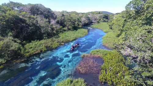 Em seguida, é hora de se dirigir até o ponto de início da flutuação. Para isso, será utilizado um barco movido a motor elétrico, o qual sobe cerca de 1.300 metros do Rio Sucuri, apresentando essa bela paisagem em um divertido passeio antes mesmo de cair na água.