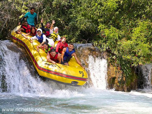 Realizado em botes infláveis, com capacidade para até 12 pessoas, a atividade é feita em um dos principais rios da região, num percurso de 6 quilômetros, que incluem o trajeto ao local da descida e o percurso feito no rio, os participantes passam por três cachoeiras e duas corredeiras com uma parada para banho de aproximadamente 20 minutos.