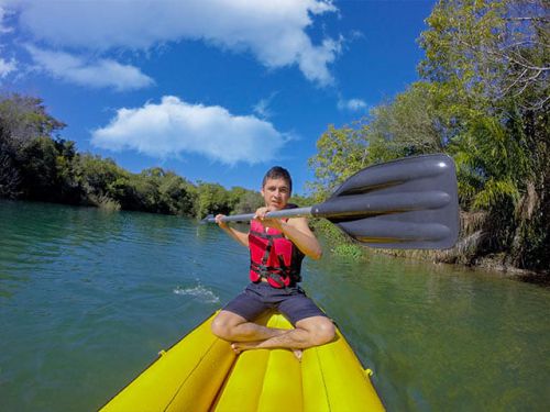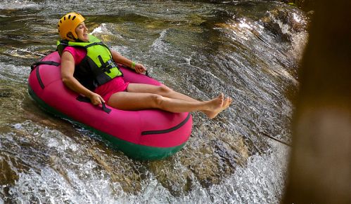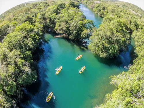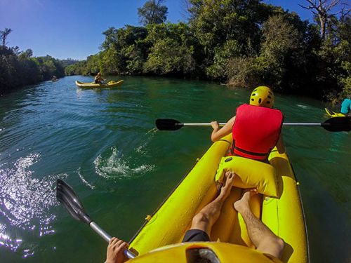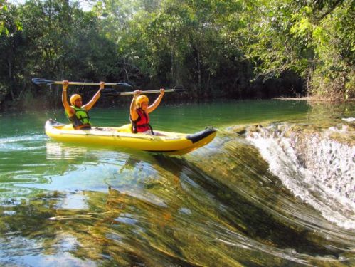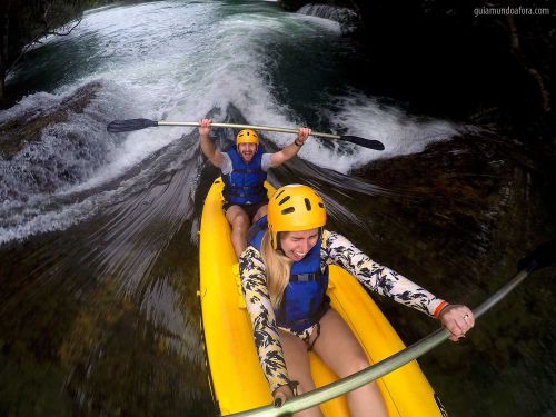 DUCK – Caiaque inflável a remo que permite duas pessoas, ambas com remo e controlando a velocidade e a direção. Em um percurso de 3km pelo Rio Formoso, os turistas, devidamente equipados com capacete e colete, descerão cachoeiras e corredeiras junto aos Guias Turísticos do atrativo. Diversão e segurança garantida! Duração média: 2hrs